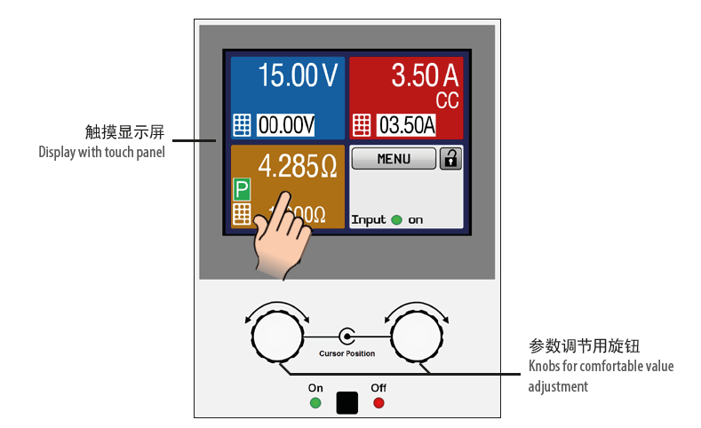 通過旋鈕或者數(shù)字鍵盤,可直接輸入或調(diào)節(jié)設(shè)定電壓、電流、功率或內(nèi)阻。