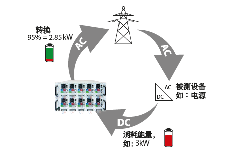 本負(fù)載最主要的特點(diǎn)是其AC輸入端,即電網(wǎng)連接端,它也可用作直流電返回的輸出端,轉(zhuǎn)換效率接近93%。這種能量轉(zhuǎn)換方式有助于降低用電成本,且避免使用昂貴的制冷系統(tǒng),因?yàn)槠胀娮迂?fù)載使用過(guò)程中會(huì)將直流輸入電量轉(zhuǎn)化成熱量,從而需要制冷系統(tǒng)進(jìn)行冷卻。
