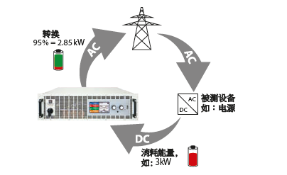 消耗能量,如: 3kW被測設(shè)備如:電源ACDC轉(zhuǎn)換95% = 2.85kW