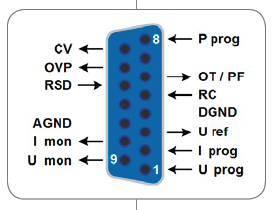 產品后板上裝有一隔離模擬接口端子。它具有一模擬輸入腳,接上0 V...10 V或0 V...5 V電壓,可設置0...100%的輸出電壓、電流與功率。要監控輸出電壓與電流,可給模擬輸出腳接上0 V...10V或0 V...5 V電壓來完成。此外,還有幾個輸入腳和輸出腳,可用來控制和監控產品狀態。