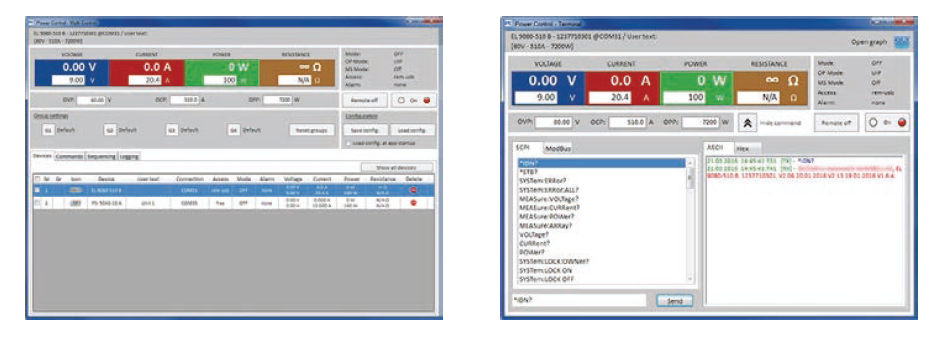 通過電腦遠(yuǎn)程控制本產(chǎn)品,可以使用隨附產(chǎn)品的EAPower Control軟件。它可同時(shí)應(yīng)用于多臺(tái)不同或同型號(hào)的PS 9000 2U 系列產(chǎn)品上,對(duì)其監(jiān)控與控制。本軟件還有一固件更新工具,以及數(shù)據(jù)記錄功能,和用半自動(dòng)表格處理來控制產(chǎn)品的特征。對(duì)于更復(fù)雜的應(yīng)用,還提供有一個(gè)完整的編程文件,以及可直接應(yīng)用的LabView VIs。PS 9000 2U所有型號(hào)支持通用SCPI指令語(yǔ)言,以及ModBus RTU通訊協(xié)議。但是帶3 W選項(xiàng)功能的型號(hào),通過GPIB端口僅能使用SCPI語(yǔ)言。