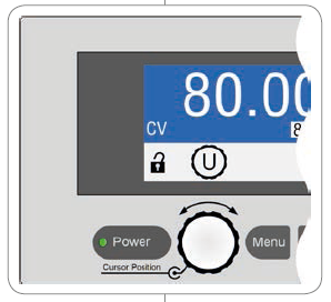 通過該顯示器,電壓與電流的實際輸出值和預(yù)設(shè)值,(CV, CC, CP) 實際控制狀態(tài)與其它狀態(tài),報警與設(shè)置菜單的設(shè)定,都清晰顯示出來。