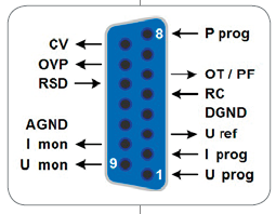 要監(jiān)控輸出電壓與電流,可給模擬輸出腳接上0 V...10 V或0 V...5 V電壓完成。此外,還有幾個輸入腳和輸出腳,可用來控制和監(jiān)控產(chǎn)品狀態(tài)。