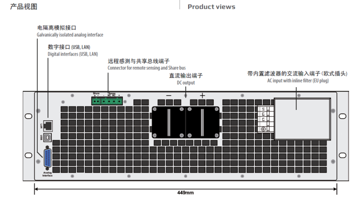 本系列有0...40 V和0...1500 V輸出電壓,0...30 A和0...510 A輸出電流,0...3.3 kW,0...5 kW,0...6.6kW,0...10 kW或0...15 kW輸出功率的不同型號。輸出端位于產(chǎn)品后面板上。