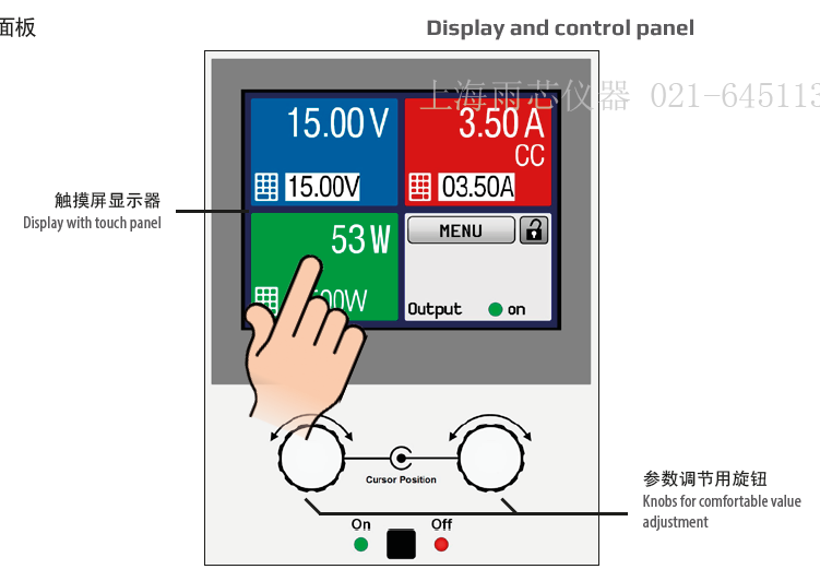 設(shè)定與實際輸出電壓、電流與功率都清晰顯示于圖形顯示器上。彩色的TFT屏幕為點觸式,用一個手指就能控制所有功能。通過旋鈕或者數(shù)字鍵盤直接輸入?yún)?shù),也可調(diào)節(jié)設(shè)定電壓、電流或功率。若想防止意外操作,可鎖定所有操作鍵。
